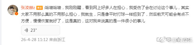 2026年4月28日上午,演员张凌赫因拍摄新剧受伤引发粉丝担忧后,亲自空降微博超话连发多条语音向粉丝报平安,强调伤情轻微如"打球扭到",并呼吁大家不必过度担心。
