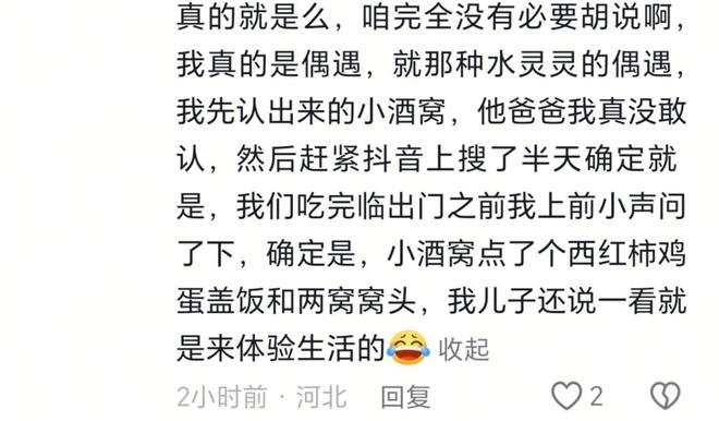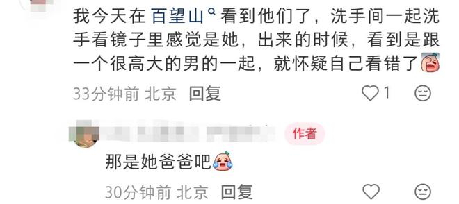 还有一位网友说,在百望山看到他们。当时,网友和小酒窝一起在洗手间里洗手,出来的时候她跟一个很高大的男的在一起,就以为自己看错眼了。实际上,那是她亲爸。