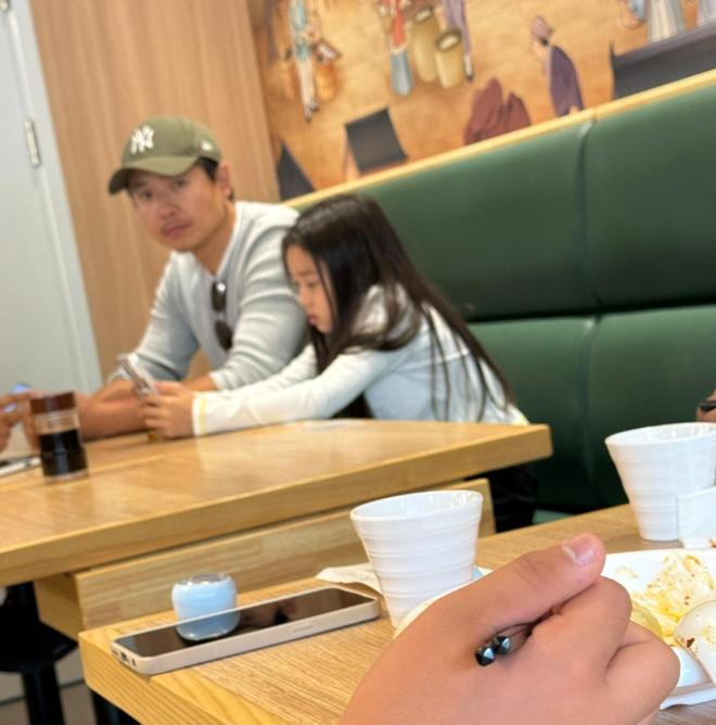 小酒窝一头长发自然垂下,身穿一件灰色上衣,手里正在看手机。突然发现,在亲爸爸身边的她有种撒娇的乖乖感。而且,在爸爸高大身躯的对比下,她显得小小,让人一度产生是她小时候的错觉。