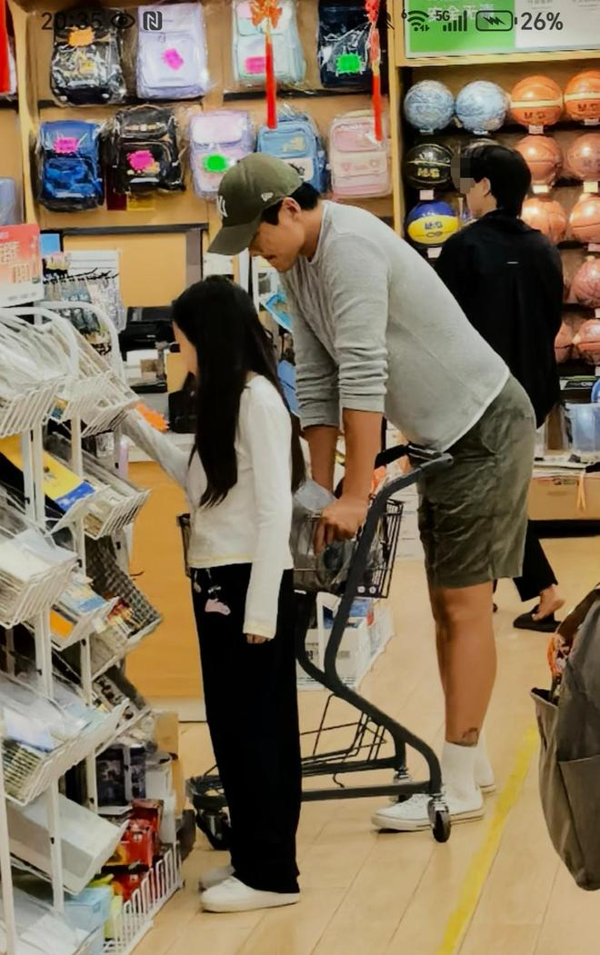 高云翔灰色上衣搭配军绿色中裤,脚穿白色长袜和鞋子。值得注意的是,他脚上有纹身,一看就是他本人无疑。他推着一个小购物车,正弯腰低头看着推车里的商品。
