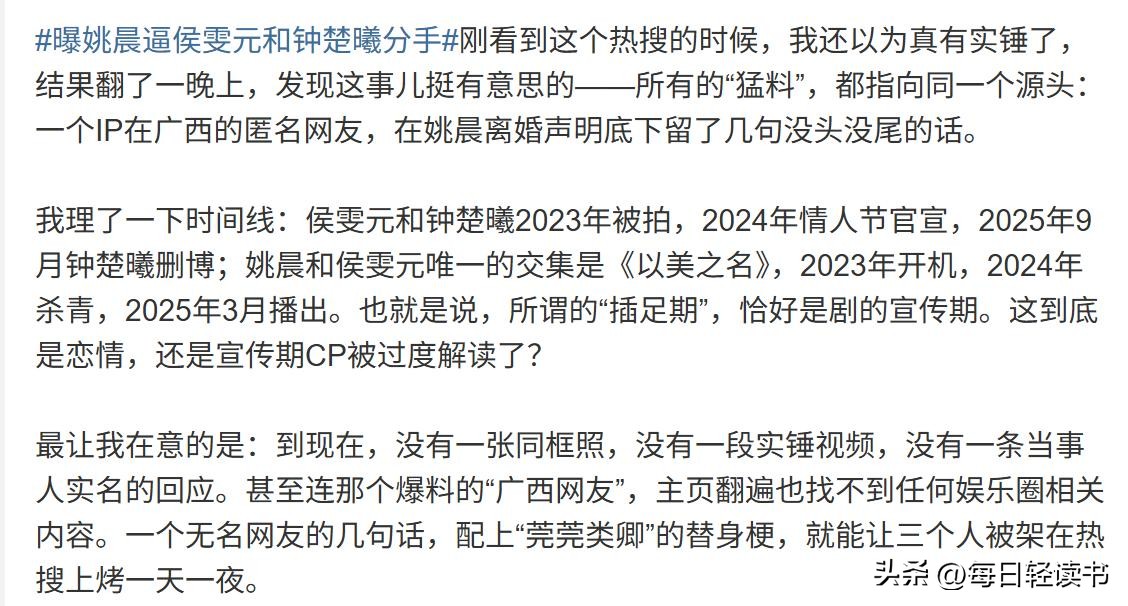 甚至还曝光侯雯元当初和钟楚曦分手就是姚晨逼的。