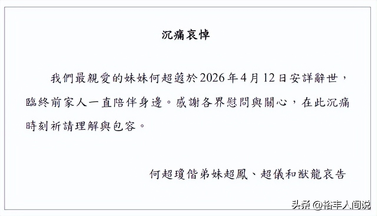 4月12号,港媒传出悲痛消息,赌王何鸿燊女儿何超蕸不幸因病去世,享年60岁。据悉,相关的噩耗来自信德集团,上面还附有一则通告,赫然写着:我们最心爱的妹妹何超蕸于2026年4月12号安详辞世,临终前家人一直陪伴身边……