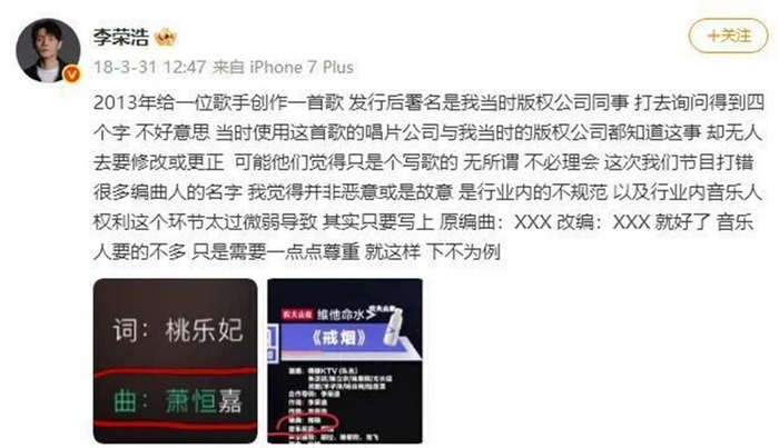 这种意识的形成,源于他作为创作者亲身经历的伤痛。 时间倒回2018年3月,李荣浩曾为《偶像练习生》节目错标编曲人署名而公开发声维权。 他在文中透露,早在2013年,他为一首歌创作后,发行时署名却被换成了当时版权公司的同事。 他打电话询问,只得到“不好意思”四个字。 使用方和版权公司都知道此事,却无人愿意去修改更正。 他当时就痛心地指出,问题根源在于“行业内的不规范”和“行业内音乐人权利这个环节太过微弱”。 他当时的诉求很简单:“音乐人要的不多,只是需要一点点尊重。 ”