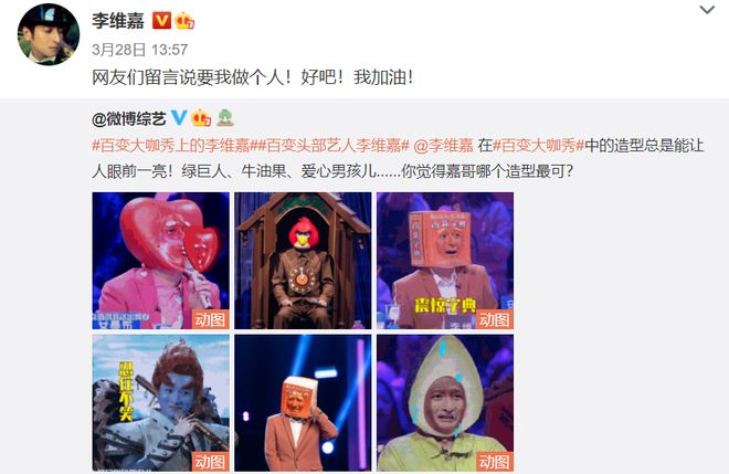 看到自己的各种头部造型上了热搜,李维嘉也是哭笑不得,他就在微博中发文回应了此事:“网友们留言说要我做个人!好吧!我加油!”这句话把大家都逗乐了。