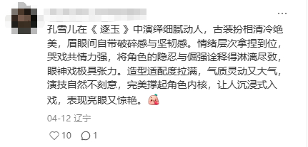 2026年初,《逐玉》播出,俞浅浅与皇长子孙齐旻组成的“不齐而俞”CP迅速出圈。极致拉扯的情感戏、破碎又带感的人设张力,让这对副CP单日话题阅读量轻松破亿。孔雪儿凭借这个戏份并不算最多的角色,整部剧播出期间涨粉超过80万。观众开始重新审视这个“演了四年配角”的女演员,发现她的每一场哭戏、每一个眼神,都有着非科班出身的演员用实实在在的“量”换来的“质”。