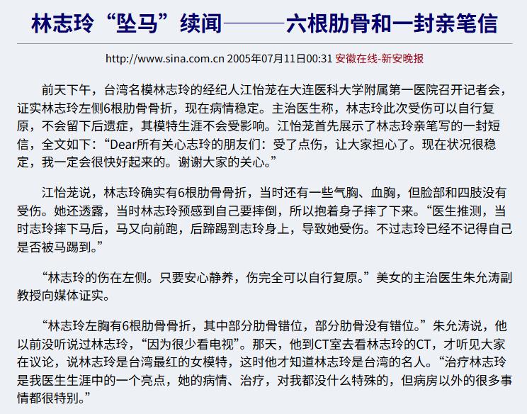林志玲拍摄广告时意外坠马,给她身体带来了巨大的伤害。