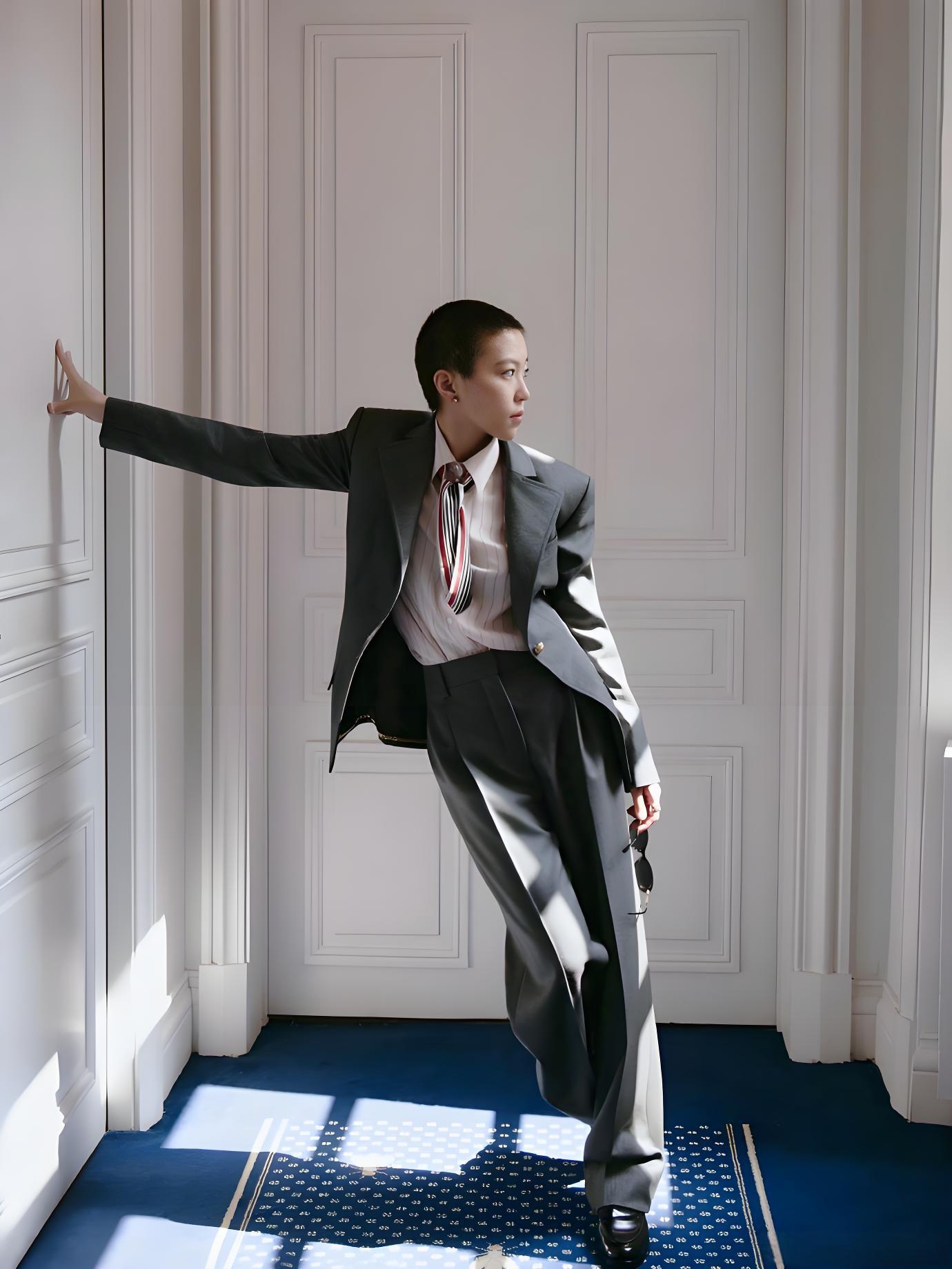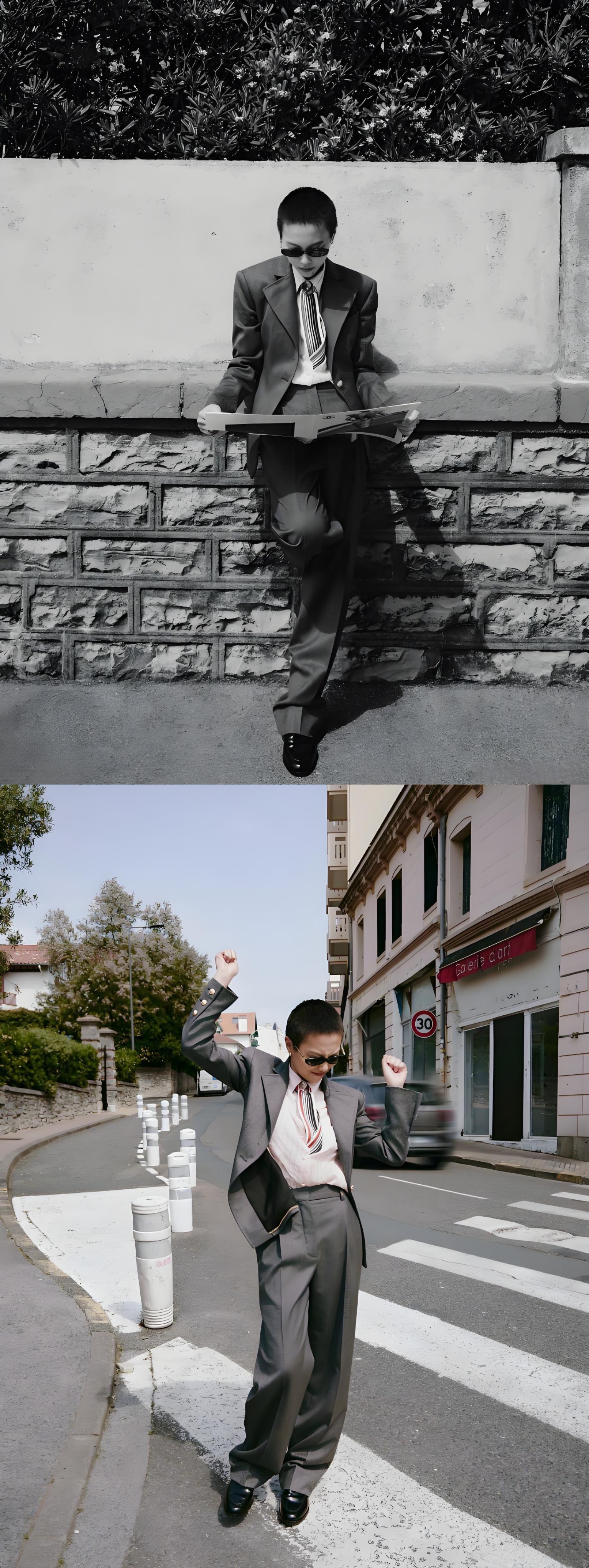有时候她倚着墙面翻两页杂志,抬眼的瞬间慵懒又漫不经心;有时候沿着斑马线走几步,抬手的姿态随性又洒脱,西装的规整质感和她身上自带的不羁感撞在一起,没有半分刻意凹造型的僵硬,只剩下不受束缚的少年气。