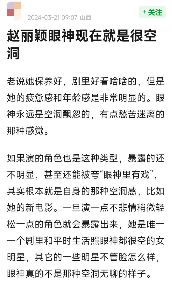雪上加霜的是,《与凤行》播出之后,赵丽颖的演技再次受到质疑,其表演时眼神空洞的问题暴露无遗。这也可以说是赵丽颖表演中的顽固问题了,当初在《知否知否应是绿肥红瘦》热播的时候,就有观众提到过。