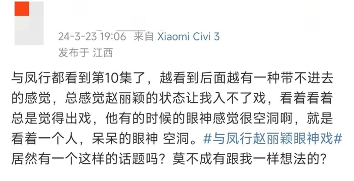 很多追剧的观众都意识到了这一点,觉得《与凤行》越看到后面越有一种带不进去的感觉,赵丽颖的状态让人入不了戏,看着看着总觉得出戏,有时候眼神感觉很空洞。有的人觉得赵丽颖现在的眼神状态远远比不上当初了。