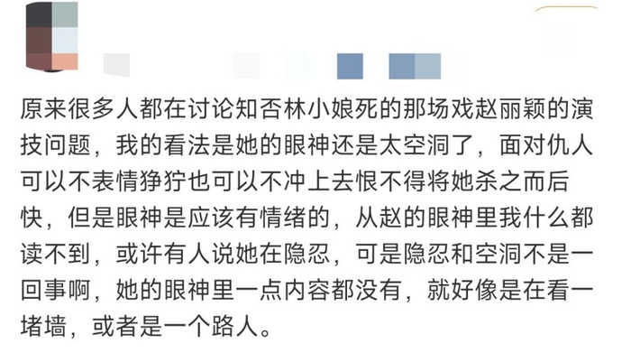 和热度一起下滑的还有主演的口碑,其中女主演赵丽颖的演技还受到了质疑。有观众直言虽然大家总说赵丽颖保养得好,剧里好看什么的,但是她的疲惫感和年龄感是非常明显的,眼神永远是空洞飘忽的。总的来说,就是赵丽颖的眼神很空洞。