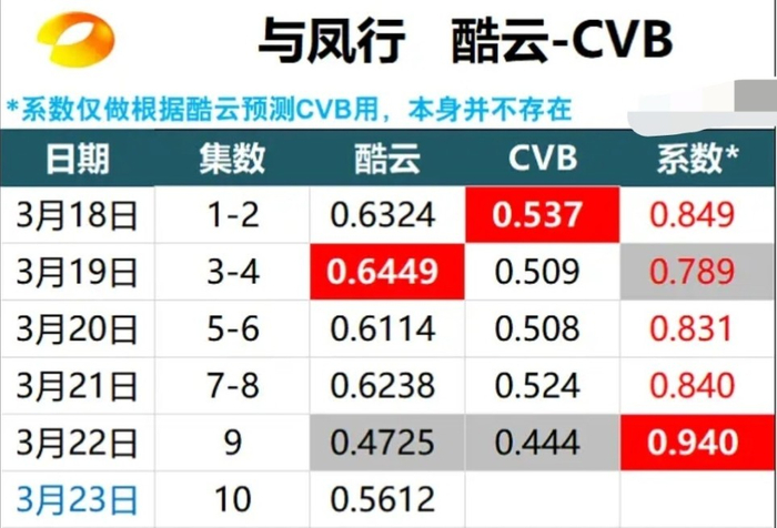 从某网友制作的《与凤行》收视率数据表中可以看到,该剧开播当天的CVB还在0.5以上,但是之后却接连下跌,最近的收视率已经跌到了0.4。与此同时,其酷云数据也从0.6跌到了0.5。