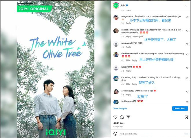 早在剧集上线之前,就有许多海外用户对该剧充满期待,并积极催促上线,播出后,爱奇艺国际版评论区海外观众好评不断,在海外社交媒体也都能看到来自各国网友对剧集的正向评价,大家纷纷留言追更。值得一提的是,《白色橄榄树》还推出了泰语配音版,受到不少泰国观众的喜爱,他们在社交媒体上评论说,“感谢爱奇艺出泰语版,已经一口气看到第七集了”“简直追得停不下来”。