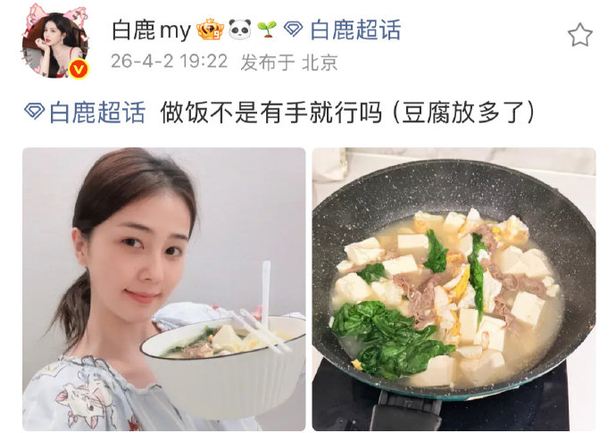 话题#白鹿豆腐放多了##白鹿素颜做饭照#登上热搜,粉丝纷纷留言“豆腐多少都爱吃”“求教程”,并制作“自信鹿大厨”表情包。