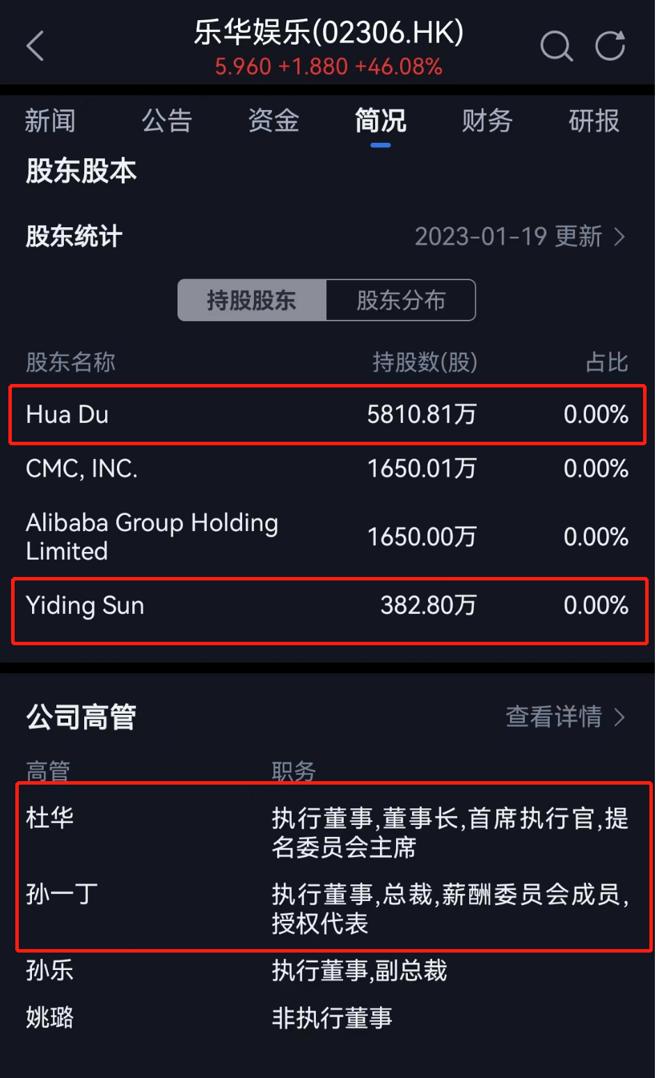 尽管当时乐华娱乐没有披露,但持股股东资料显示,上市后董事长杜华独占了5810万股,是公司最大股东,排在第二位和第三位的是CMC华人文化和阿里巴巴,第四位是高管孙一丁,382万股,这意味着上市时王一博得到的原始股肯定低于这个数。