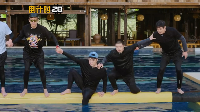 当时导演组给男嘉宾们布置任务,要求大家在十秒钟内,从水里爬到泳池中的平衡木上并成功站起来。这个游戏确实有一定难度,但对于成年男性来说,并不算特别苛刻的挑战。