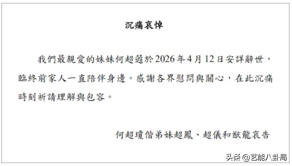 目前,何家尚未公布何超蕸的离世原因及后续丧礼安排,众多网友及圈中好友纷纷留言悼念,祝愿这位一生低调行善、重情重义的豪门千金,一路走好。