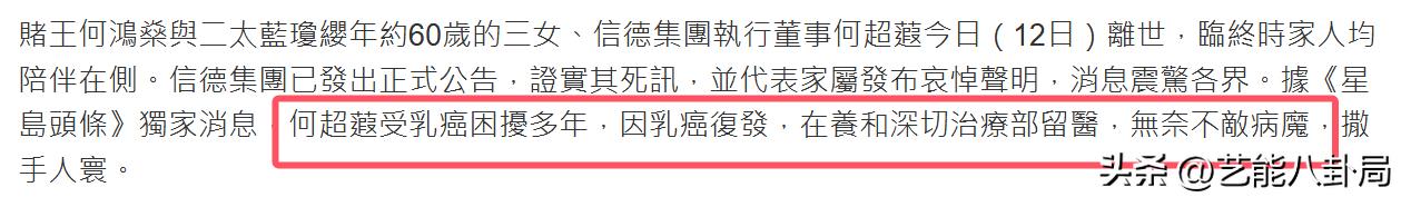 4月12日,已故赌王何鸿燊的女儿何超蕸安详离世,享年约60岁。何超琼和弟弟妹妹们联合发布讣告,透露临终前家人一直陪伴身边。据港媒报道,何超蕸罹患乳腺癌多年,因病情复发入院接受治疗时不幸辞世。