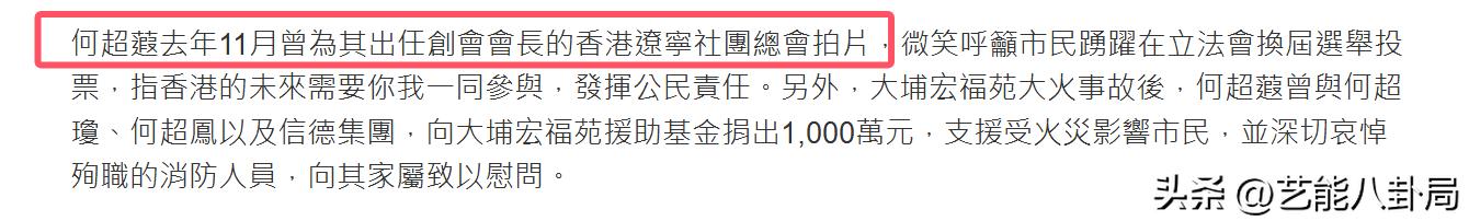 而她最后一次露面,是在去年11月,还曾和何超琼、何超凤一起为大埔宏福苑受灾市民,捐献了1000万元。这次出镜时,她的眼部和面部都比半年前更加浮肿,人看起来也更加疲惫。