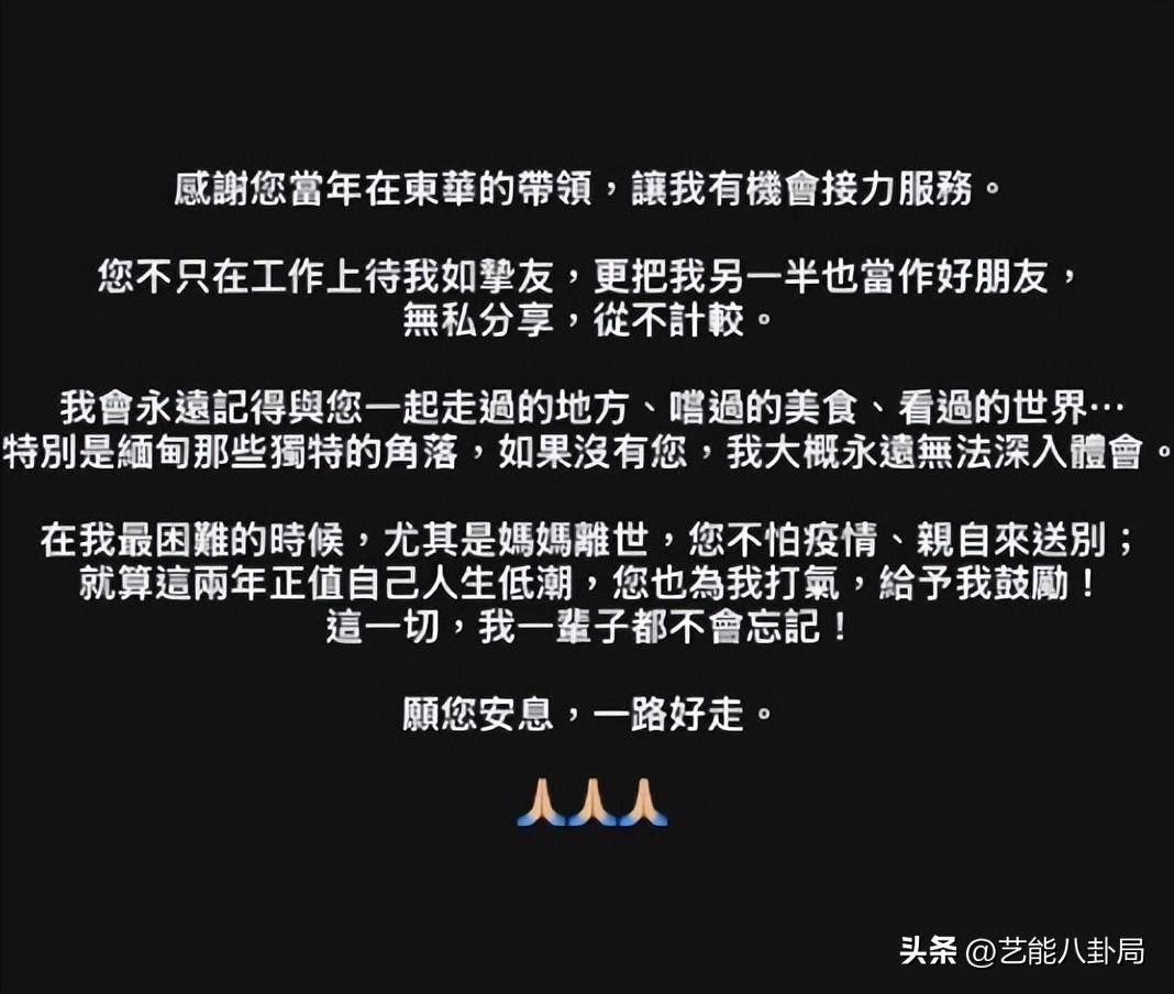 艺人王贤志作为何超蕸的挚友,也发文回忆悼念,何超蕸不仅在工作上悉心带领他,私下更是毫无保留地关心他,在他母亲离世、自身陷入人生低潮时,始终陪伴左右、给予鼓励,“这一切,我一辈子都不会忘记!愿您安息,一路好走。”