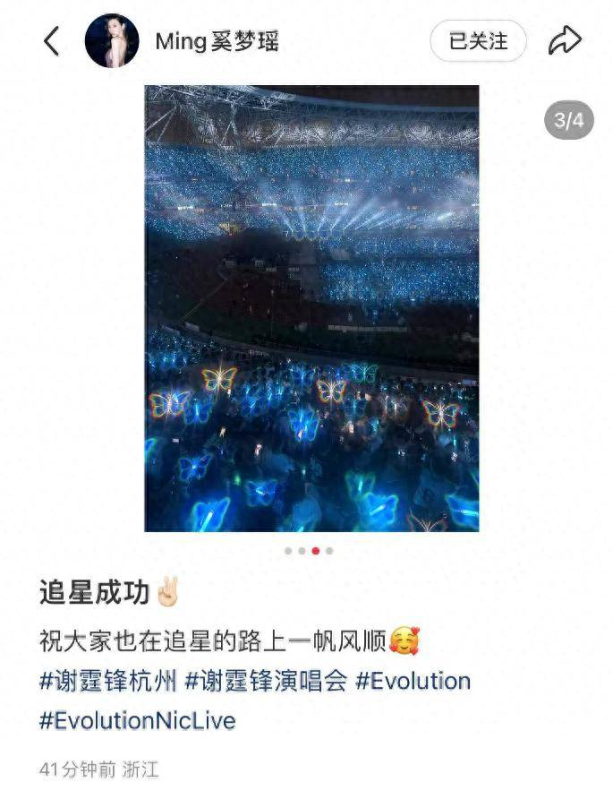 在8月10日晚,著名超模奚梦瑶通过社交媒体分享了一则动态,晒出了与丈夫何猷君一同观看谢霆锋演唱会时的温馨照片。她配文说道:“追星成功,祝大家在追星的路上一帆风顺。”众所周知,奚梦瑶一直是谢霆锋的忠实粉丝,这次能与何猷君一起共享偶像的演出,更是让人感到甜蜜。