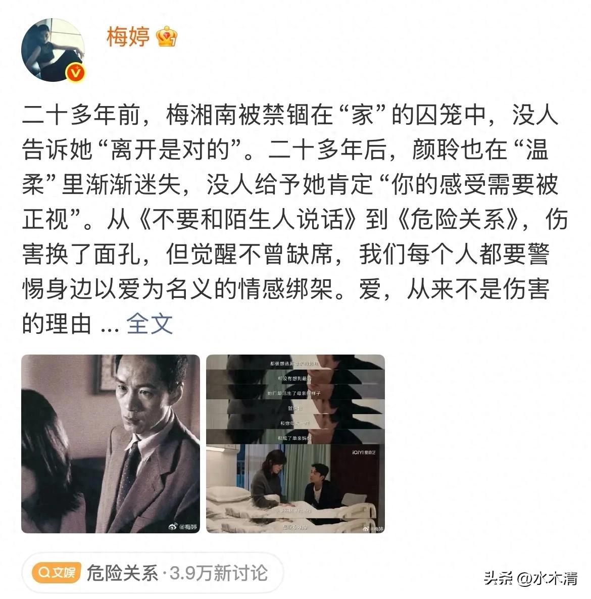 她将25年前在《不要和陌生人说话》中饰演的受害者“梅湘南”,与孙俪新剧《危险关系》中遭遇精神操控的角色“颜聆”连在了一起。