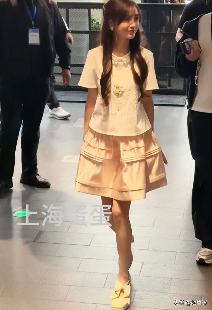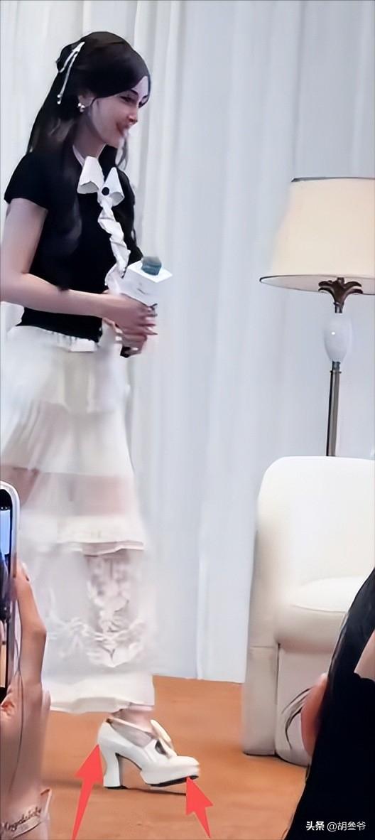 脚上的高跟鞋还明显不合脚,走路时刻意踮脚,时不时调整鞋子的模样,确实少了点顶流女星的精致。