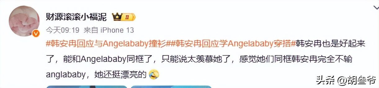合影之后,韩安冉第一时间在社交平台晒出照片,配文“内娱第一神颜,我往那一站就是Angelababy的兵”。
