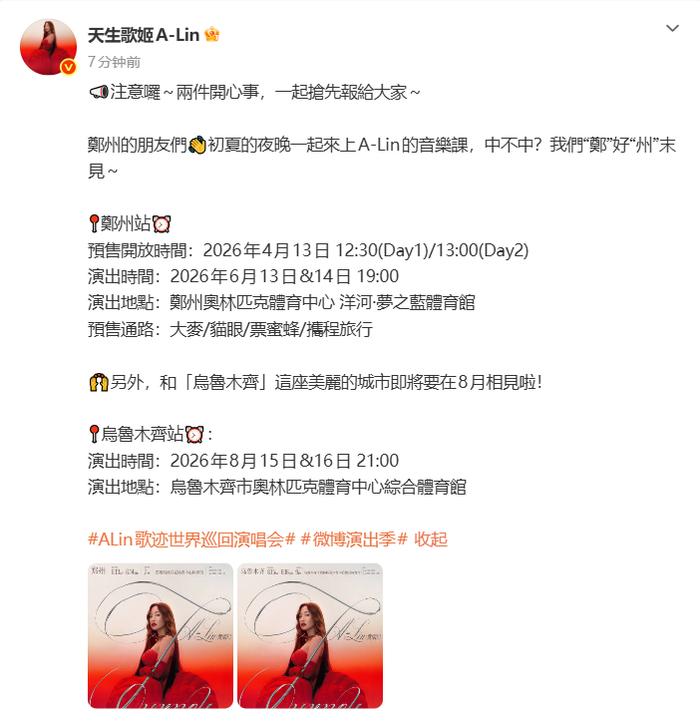 来源:天山网微信公众号综合A-Lin黄丽玲个人微博、大麦网