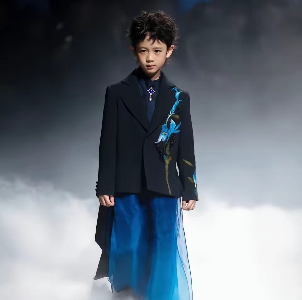 庆宝迈步走秀时,衣袂随风轻轻飘动,身姿挺拔又轻盈,宛若从画卷中走出的小仙童,将国风美学的温婉与飘逸展现得淋漓尽致。两种风格无缝切换,足以看出庆宝出色的镜头感和走秀天赋,小小年纪便拥有如此出众的台风,实在令人惊叹。