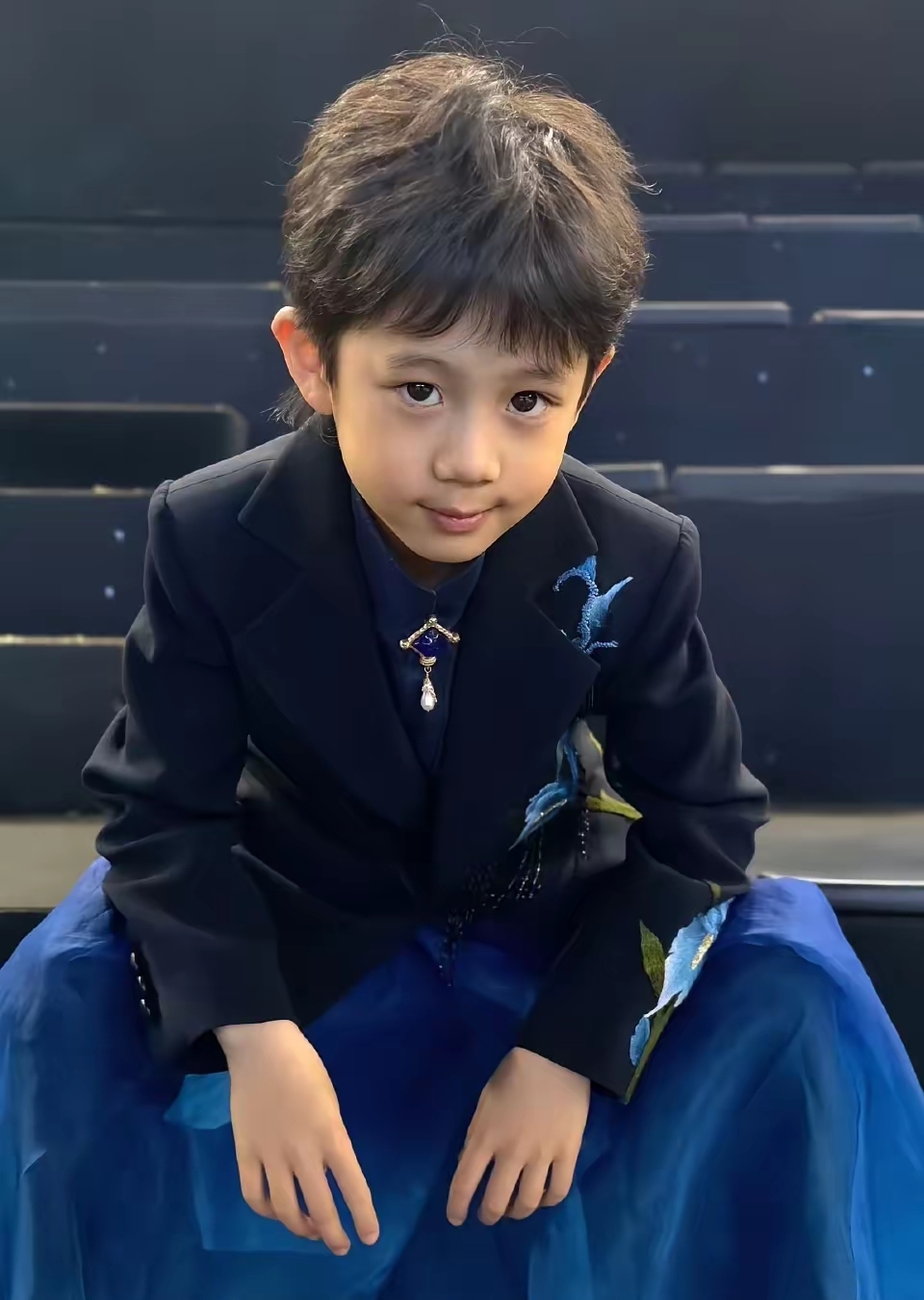 其中一套造型将帅气与柔美巧妙融合,黑色西装利落干练,搭配绣有精致蓝色花朵的纱裙,经典与灵动碰撞出独特的时尚感。