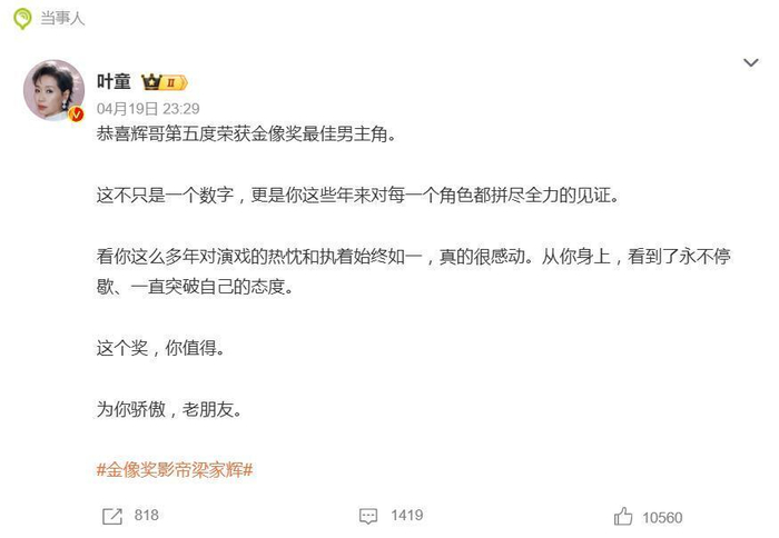 叶童的祝贺文案,没有客套,全是干货。她写道:“这不只是一个数字,更是你这些年来对每一个角色都拼尽全力的见证。”一句话,就点破了梁家辉这第五座影帝奖杯的含金量所在——不是资历的累积,而是每一次都从零开始的拼命。