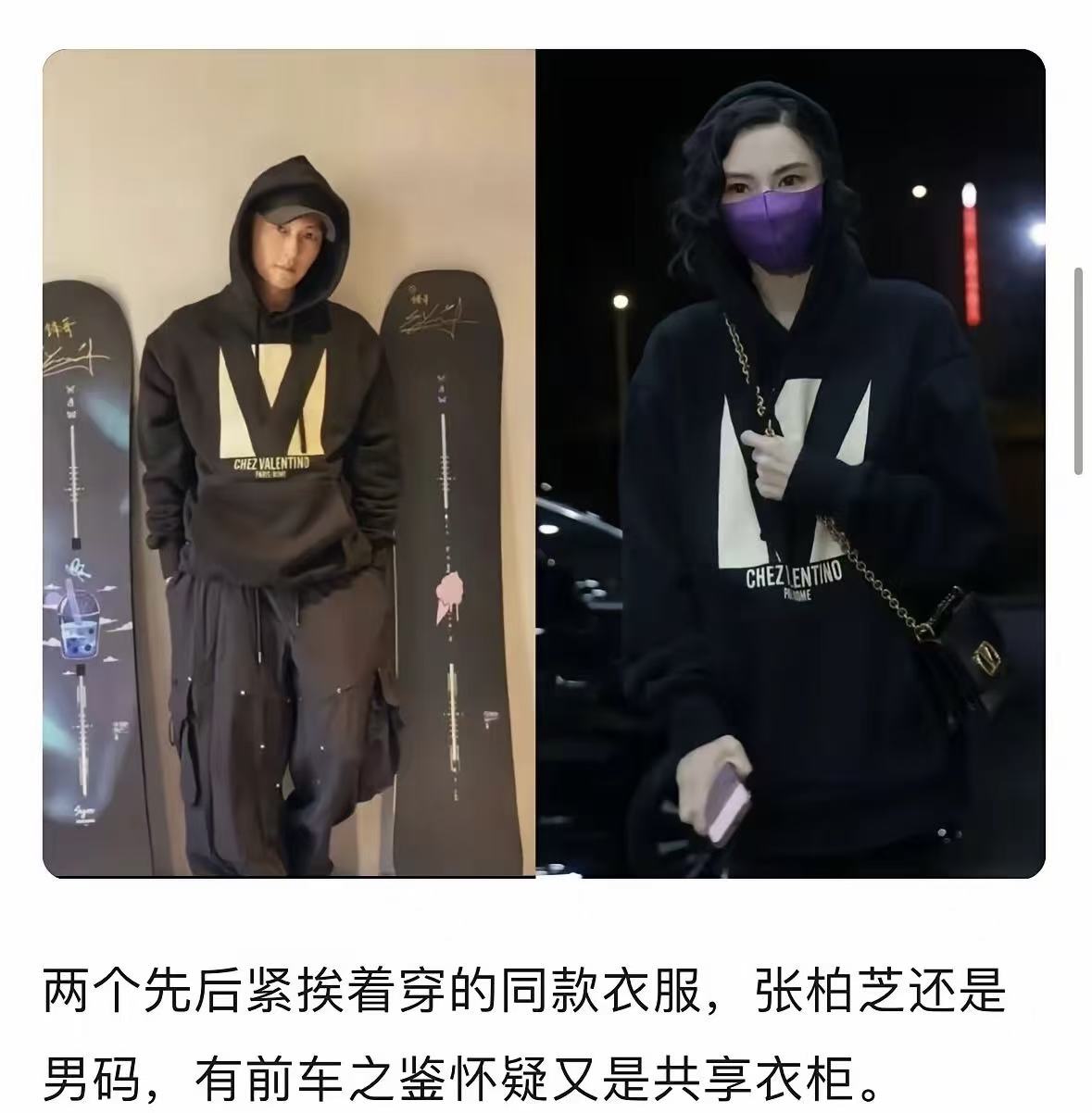 除了迷彩服外,网友又扒出张柏芝和谢霆锋的另外一款同款衣服。谢霆锋依旧站在滑板上拍照,两人穿这款衣服时都喜欢把帽子戴在头上。