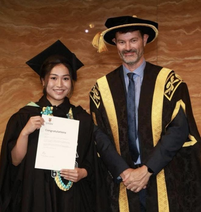 照片里的曾凯栭穿着标准毕业袍,戴着四方帽,手里捧着黎瑞恩特意送的鲜花,满脸都是挡不住的青春笑容。皮肤满满的胶原蛋白,整个人亭亭玉立,笑起来灿烂得像澳洲晴天的太阳,说不出的元气活力。黎瑞恩今年已经五十三岁,状态却好得没话说,站在女儿身边,完全看不出真实年纪,气质大方又温柔。谁能想到,这个看起来从容优雅的女人,在典礼现场哭了整整一整场。