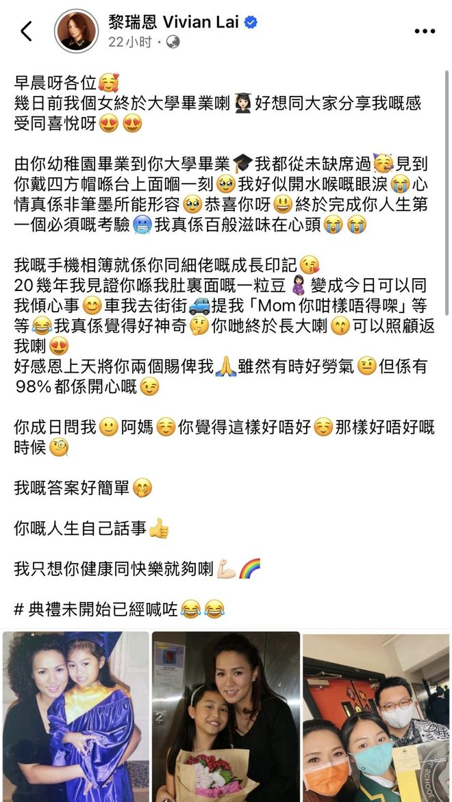 黎瑞恩自己在分享的时候说,看到女儿走上台,被校长戴上四方帽接过毕业证书那一秒,眼泪直接控制不住狂涌出来。其实典礼还没正式开始,她坐在台下看着人群里打扮好的女儿,就已经忍不住掉眼泪,从开场哭到结束,说“从头哭到尾”一点都不夸张。这种心情真的没办法用文字说清楚,百般滋味涌在心头,只有这么多年一路走过来的她自己才能完全体会。这不只是开心女儿完成了人生第一阶段的考验,更是感慨自己这么多年的不容易终于有了结果。