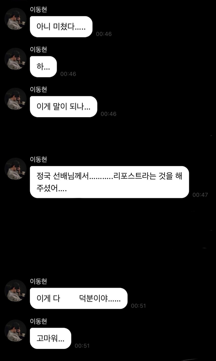 👤 不是吧 我要疯了吧… 哈… 这怎么可能… 柾国前辈他… 转发了这条视频… 这全都是托大家的福啊… 谢谢你们…