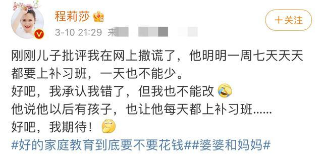 程莉莎曾在节目中称为孩子花钱上补习班会遏制他们的兴趣爱好,她似乎并不赞成这种教育方式。