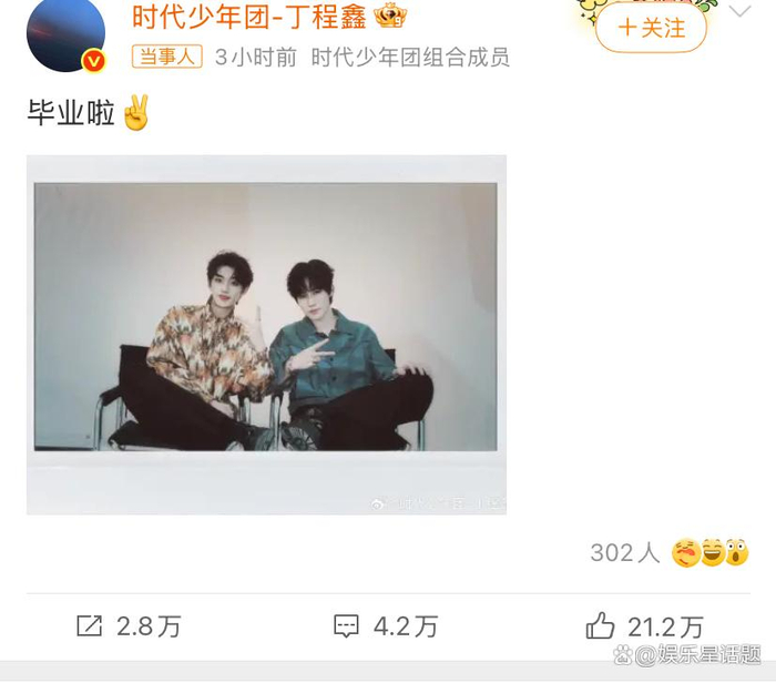 2025年7月1日,娱乐圈迎来双喜临门——时代少年团成员丁程鑫、张真源同步晒出毕业拍立得,用胶片质感的瞬间定格青春。丁程鑫在微博发布“毕业啦 ️”九宫格,身穿北电学士服对镜头比耶,阳光穿透树叶的光斑落在他肩头,像极了校园剧男主角的完美ending。而中戏音乐剧专业的张真源则晒出与同学搞怪合影,其中一张与丁程鑫头碰头的拍立得引发粉丝狂欢,两人手举“毕业证”道具卡,眼角眉梢都是藏不住的少年意气。