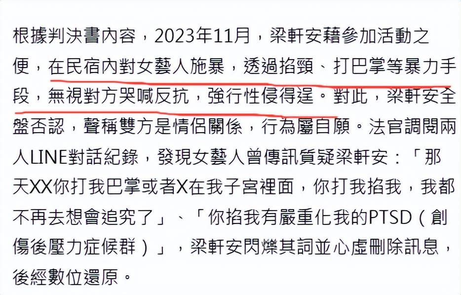 法院判决书载明:2023年11月,梁轩安借参加活动的名义,在民宿内强行对一名女艺人施暴,不仅掐住对方脖子、扇巴掌,还强行与女艺人发生关系并得逞。