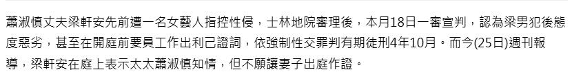 **吃瓜必看:梁轩安强暴女艺人被判,自称心情好,发10条声明回应!**,台湾娱乐圈的天空被一波劲风大作战彻底扫翻,谁能没听说过这段“轰炸头”?一段看似 “天作之合”、又似 “豪门恩怨”、更像 “伦理禁区” 的恋爱故事,直接把“吃瓜”达人级别拉满!台湾知名女演员萧淑慎的现任老公梁轩安,居然还敢玩出这样的花样?!,### **一段“炸裂”恋爱史:从小鲜肉到大懦子**,萧淑慎,是台湾娱乐圈的“御用性感女主角”,曾经因一系列风波退出娱乐圈,彻底息影,她的恋爱故事却是另一番天地,2026年,一个让人看傻眼的新闻点来了——梁轩安,比萧淑慎小15岁,两人在2016年相识时,梁轩安还只是个小新人,甚至连结婚都没等过呢?!不对,不对,等一下,梁轩安当时已经结婚有女儿了,直接跟在家里人离开,和萧淑慎火了,公开放出“亲密照”高调示爱,简直是“抢手段”啊!,### **“23天热恋”:小鲜肉玩大牌**,两人相识23天就要上婚礼,场面堪比电视剧!梁轩安的前妻看到这场“狂欢”后,直接“切断”了,留言给他:“2年婚姻拜拜了,祝福你和萧阿姨啰。”这波操作,简直是“豪门恩怨”开外传!等到2025年,萧淑慎就曝光了这段婚姻的危机,说梁轩安多次出轨,两人早已没了正常生活,甚至她厌恶他碰自己,都觉得恶心。,### **“强暴女艺人”事件:从“好丈夫”到“恶棍”**,2023年11月,一场更让人唏嘘的风波来了!梁轩安借着参加活动的名义,在民宿内对一名女艺人施暴,不仅掐住对方脖子、扇巴掌,还强行与女艺人发生关系,事后,他还心虚地删除了女艺人的短信,幸好警方通过技术手段复原了短信,才让这场恶行无处遁形,作为有妇之夫,他居然还敢玩出这种花样,真是“大坏蛋”写不过!,2026年3月18日,司法判决结果出炉,梁轩安因“强制性交罪”被依法判处有期徒刑4年10个月,面对这一判决,梁轩安居然还能“笑得出来”,甚至还直言“心情非常好”,一副若无其事的样子,简直是“大无所谓”啊!更绝的是,他在法庭上还大言不惭地称,妻子萧淑慎对此事知情,只是不愿出面作证,结果,梁轩安随后连续发布10条声明,声称判决结果有误,自己是被人设局,还强调此事与妻子无关。,### **“真相”与“伪善”:谁在说谎?谁在自我救赎?**,萧淑慎早已表态,与梁轩安早已“井水不犯河水”,就连梁轩安碰她一下,她都觉得恶心,更让人费解的是,梁轩安居然还敢呼吁媒体不要提及妻子的名字,称一切都与萧淑慎无关,就在这篇采访发表后,梁轩安突然“惊醒”,开始频繁发布声明,试图洗清嫌疑,看来,这位“大懦子”终于被“揭穿”了。,### **吃瓜总结:爱情需要勇气,现实需要勇气**,“爱果然需要‘勇气’啊”,这句歌词在这里简直是“命题题”,萧淑慎和梁轩安的爱情,顶着漫天骂名、巨大的年龄差和一段“灰色”婚姻,确实需要“勇气”,但现实呢?现实却像一块大石头,压得他们喘不过气来,梁轩安不仅没能成为一个合格的丈夫,还敢玩出“强暴女艺人”这种“恶行”,简直是“天杀的代名词”。,而萧淑慎,早已心灰意冷,既然离不了婚,便选择各自独立,两人关系甚至不如陌生人,梁轩安还在狭狱中挣扎,案件可能还会上诉,结果还不明确,我们不禁要问,真相何时会浮出水面?希望相关部门能彻查此事,还给大众一个清清楚楚的答案。,毕竟,吃瓜不光啊,真相才是最重要的!