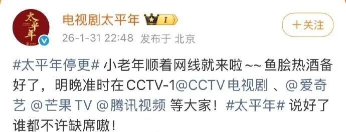 1月31日晚,#太平年停更# 登上微博热搜,随后 @电视剧太平年 发博回应:小老年顺着网线就来啦~~鱼脍热酒备好了,2月1日晚准时在CCTV-1@CCTV电视剧、@爱奇艺@芒果TV @腾讯视频 等着大家,说好了都不许缺席嗷。
