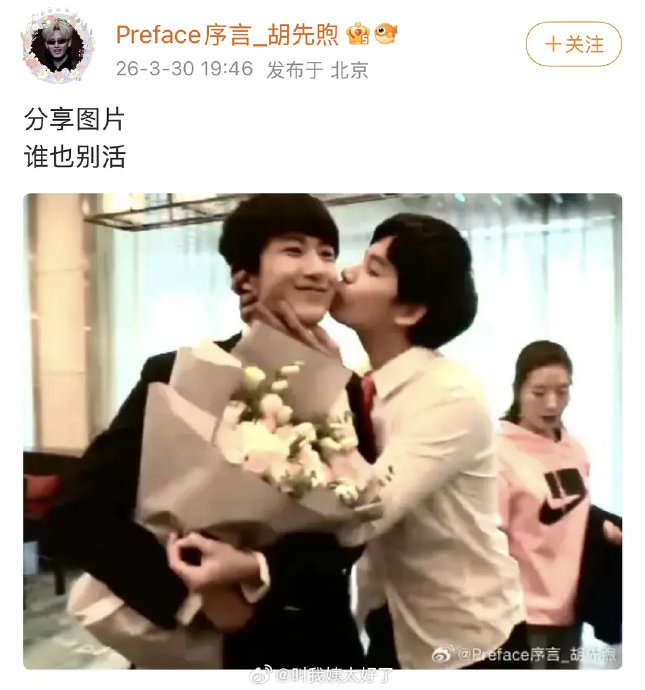 2026年3月30日,认证账号“Preface序言_胡先煦”(胡先煦官方站姐)发布涉及郝富申的图文内容,甚至包含疑似艺人亲密互动的CP向(“郝胡CP”)物料。此操作迅速引发热议,被网友称为“打响愚人节第一枪”。站姐在发布郝富申内容(如亲吻脸颊图)遭超话屏蔽后,随即转向发布胡先煦生图,更凸显其行为的刻意性与话题性。此举被广泛解读为一场精心策划的“愚人节团建”,与同期发酵的话题#站姐愚人节团建预告#形成直接呼应,部分网友甚至提前预告“郝富申胡先煦床照新图”,为节日氛围预热。