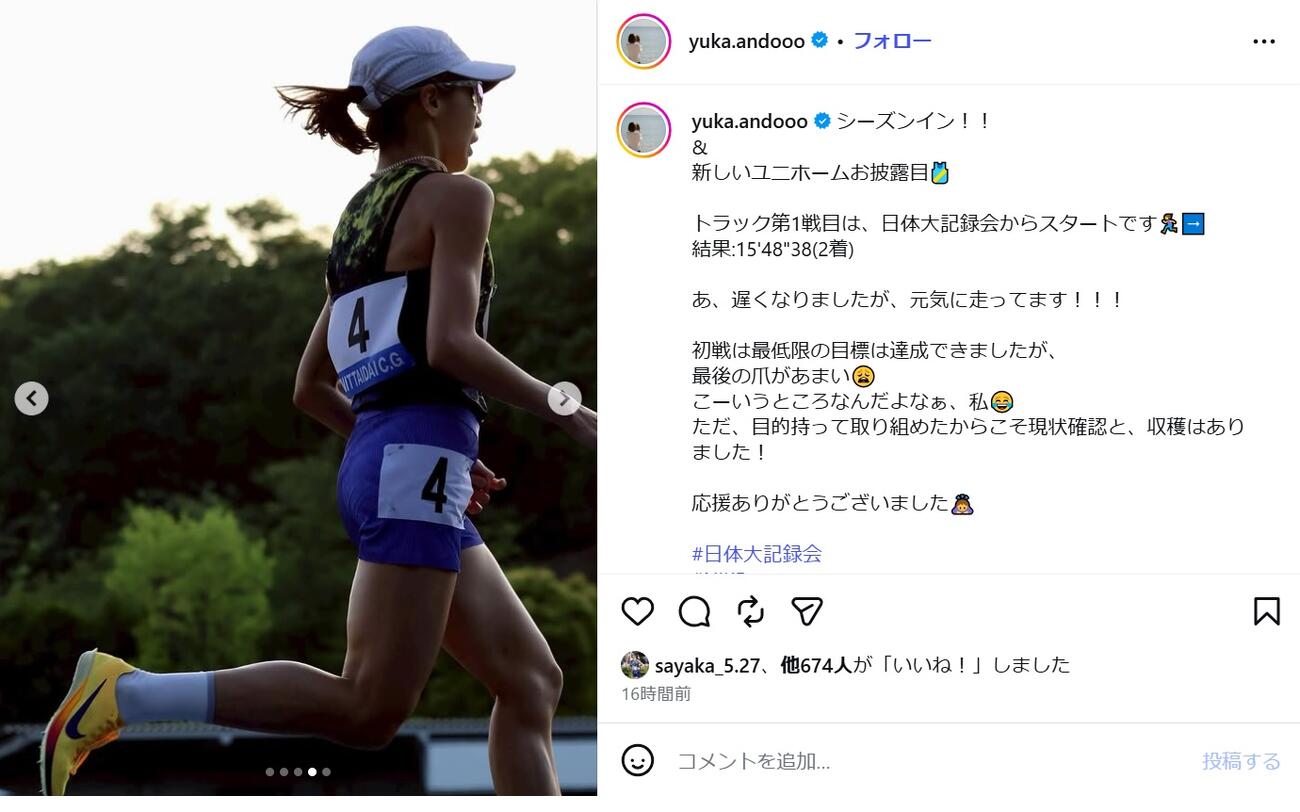 安藤公开了穿着黄色衬衫和紫色裤子的新队服奔跑的样子,“赛道第1站,从日本体育大记录会开始结果:15’48’38(2位)啊,有点晚了,不过跑得很好! ! !”并报告现状。