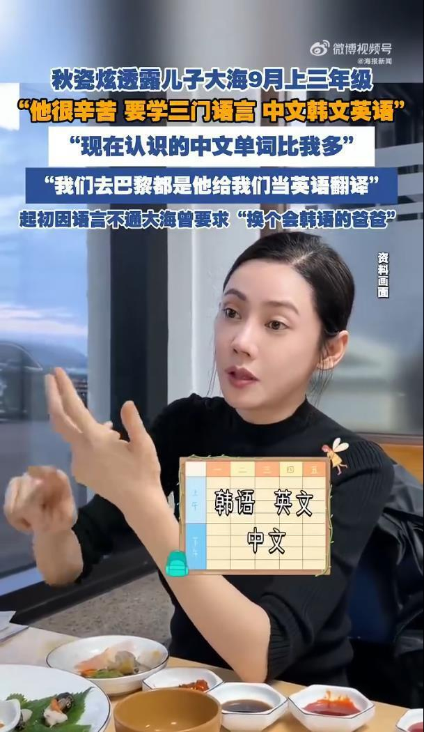据 4 月 7 日报道,近日,韩国演员秋瓷炫一句 " 他很辛苦,要学三门语言 ",把她那 " 开挂 " 的儿子大海送上了热搜。原来,今年 9 月才上三年级的 7 岁大海,正同时攻克中文、韩文和英文三座大山,其 " 战果 " 之辉煌,甚至已经反超了妈妈。