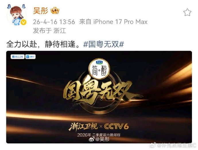 据节目总导演吴彤及浙江卫视官方微博于2026年4月16日发布的权威消息,《国粤无双》确认将于2026年第二季度(4月至6月)的每周六晚间黄金时段播出。该节目由浙江卫视与CCTV6电影频道联合出品,采用双平台联动播出的创新模式,旨在覆盖更广泛的观众群体,强化文化传播影响力。