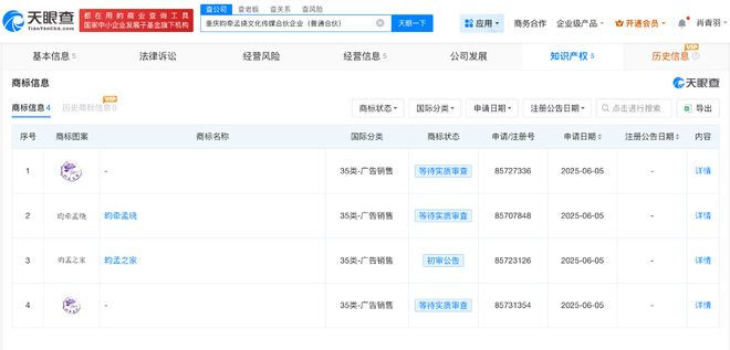 天眼查App显示,今年5月,重庆昀牵孟绕文化传媒合伙企业(普通合伙)注册成立。知识产权信息显示,该合伙企业已申请多枚“昀牵孟绕”“昀孟之家”文字和图形商标,其中“昀孟之家”已初审公告,其余商标状态为等待实质审查。