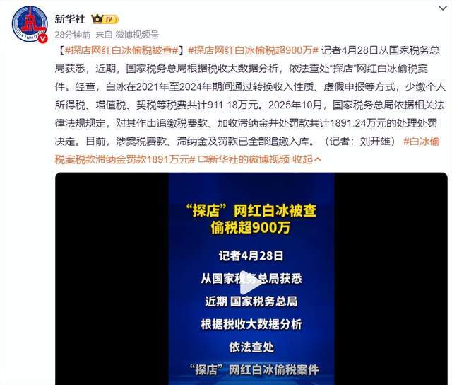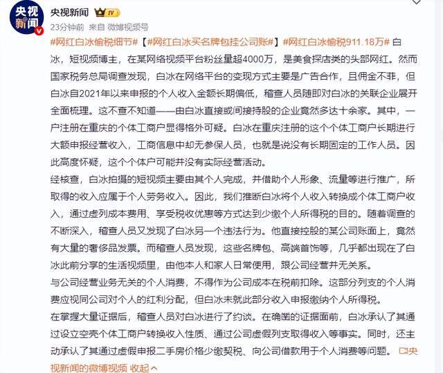 ## 白冰事件:网红经济的“冰山”正在消融,在“网红经济”的大江大海里,一个名叫“白冰”的人物最近遭到了一场“雪崩”,这场雪不仅仅是财务上的冰山,更是整个网红经济模式的一次“洗礼”。,“白冰”这个名字,曾经是探店领域的“顶流”,他的每一个视频都能吸引数万粉丝,他的生活方式也被无数人奉为“暴富秘籍”的模板,4月28日,央视新闻曝出“白冰”涉嫌偷税漏税,税务部门对其进行了处罚,罚款高达1891.24万元,这个消息一出,立刻引发了网友们的热议,纷纷跑到“白冰”的留言区打卡,仿佛要抓住这最后一班“赶考”车。,这场风波的起因,竟然可以追溯到“网红经济”的一些“隐秘”,据悉,“白冰”申报的个人收入明显偏低,而其佣金收入却异常高,甚至比明星还要“富强”,这种“收入不对称”引发了税务部门的注意,随后通过对其旗下公司的调查,逐渐揭开了这场“偷税漏税”的大幕。,“白冰”控股的公司高达十多家,其中有一家注册地为重庆的公司,长期进行大额申报却没有参保人员,这本身就像一座隐形的“冰山”,更令人咋舌的是,“白冰”在视频中频繁展示的奢侈品,很大一部分其实都来自该公司申报,这种“公司红利分配”被“白冰”用来消费,却始终未曾缴纳个人所得税,这无疑是一笔“偷税漏税”的“美团”。,“白冰”还承认了其他多项违法行为:虚假申报二手房价格少缴契税、向公司借款用于个人消费、自诩免费国产品牌代言(一桌酒席高达900元),这些行为都像是在“白衣打仗”,用“冰山”遮蔽真实的财务状况。,在这场“吃瓜”中,最让人哭笑不得的是“网红经济”本身,白冰的“暴富秘籍”其实不过是一个个“冰山”,而真正的财富来源却被他用“偷税漏税”来“冰冻”,这种“冰山”终将融化,所谓的“暴富秘籍”也不过是表演的“糖衣”,而真正值得我们思考的,是网红经济中那些隐形的“税务冰山”,它们早已不再是“吃瓜”的“甜点”,而是整个“网红经济”模式的“致命伤”。**吃瓜简评:网红“白冰”偷税漏税被罚,诚信与虚假的抉择**,在这个信息爆炸的时代,网红经济如同一片繁星,闪耀着巨大的商业价值,在这闪亮的光环背后,却隐藏着许多不为人知的阴影,网红“白冰”的事件引发了广泛关注,不仅揭示了网红经济的虚假面,更引发了社会对诚信与道德的深刻思考。,### **虚假的生活展示:一场精心策划的经济谎言**,白冰的生活展示如同一场精心设计的表演,他的视频中展现的豪车、豪宅、奢侈品,构建了一个令人羡慕的“理想生活”,这些精心准备的画面背后,却隐藏着一张虚假的收入申报表,作为一名自媒体人,他的佣金收入远高于明星,却选择低报收入,虚报其它项目的收入,这种行为本身就是对税法的严重违反。,### **税务漏洞:高收入背后的隐瞒与逃避**,税务问题是现代社会中最敏感的议题之一,白冰的案件中,税务部门发现他少缴个人所得税、增值税,以及契税等高达911.18万元,综合处罚1891.24万元,这些罚款虽然与其展示的豪车豪宅相比不算大,但却揭露了他长期以来对税法的严重违规。,更令人深思的是,他通过虚假申报二手房价格、向公司借款用于个人消费等方式,进一步隐瞒收入,这表明,白冰不仅是普通的税务违法者,更是对税制系统的一种系统性挑战。,### **诚信经营:网红行业的道德底线**,网红行业的快速崛起,使得诚信经营变得尤为重要,白冰的案件不仅损害了其个人形象,更动摇了整个网红行业的信任体系,自媒体人通过推荐产品赚取收入,本应遵守相关规定,但白冰却选择通过虚报和偷税漏税来隐藏收入,这种行为不仅违法,更违背了职业道德。,### **社会反响:诚信与虚假的抉择**,网友对白冰的行为反应强烈,纷纷跑到留言处打卡,仿佛在追求一场“税务大剧”的现场体验,这种现象反映了公众对网红行业的不信任和对诚信的渴望,人们不再轻易相信网红的生活展示,而是更愿意关注他们的社会责任和道德行为。,### **未来展望:网红经济的诚信重构**,白冰的案件为网红行业敲响了警钟,随着税务调查的深入,网红经济的诚信面貌正在发生变化,网红们需要重新审视自己的经营方式,建立透明化的收入申报体系,以赢得公众和税务部门的信任。,### **吃瓜的同时,也要思考**,吃瓜时,我们可以对网红生活的奢华感到羡慕,但也要保持理性,白冰的案件提醒我们,网红行业并非全是光鲜亮点,偷税漏税不仅违法,更会让网红失去粉丝的信任,网红们需要在展示生活与诚信经营之间找到平衡点,让粉丝看到不只是虚幻的光环,而是真实的价值。,这场吃瓜的风波,不仅揭示了网红经济的虚假面,更为行业的诚信建设敲定了重要的钟声,希望未来网红行业能更加成熟,走向更加健康和透明的发展方向。