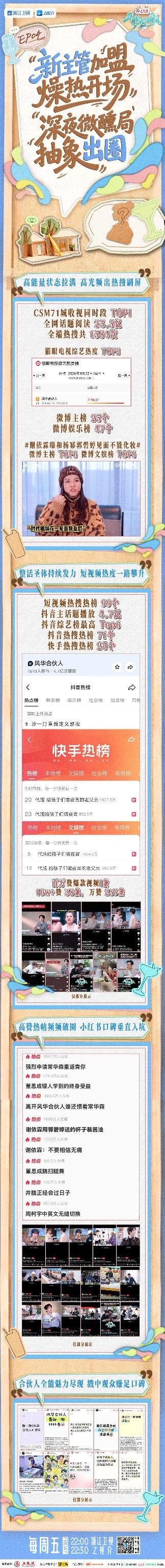 上周五,《风华合伙人》第四期播出。截至目前,节目全网热搜1584次,相关话题阅读量超23.5亿,万赞视频累计259条,其中10w+赞爆款视频38条,CSM71城同时段收视TOP1。 登微博双榜TOP6, 登快手文娱榜TOP5, 等话题登小红书热点。