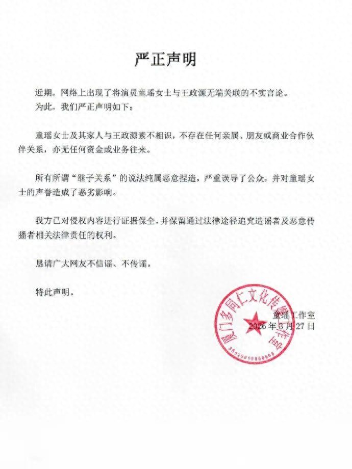 刚刚,@童瑶工作室 针对“继子传闻”发布严正声明:童瑶女士及其家人与王政源素不相识,不存在任何亲属、朋友或商业合作伙伴关系,亦无任何资金或业务往来。