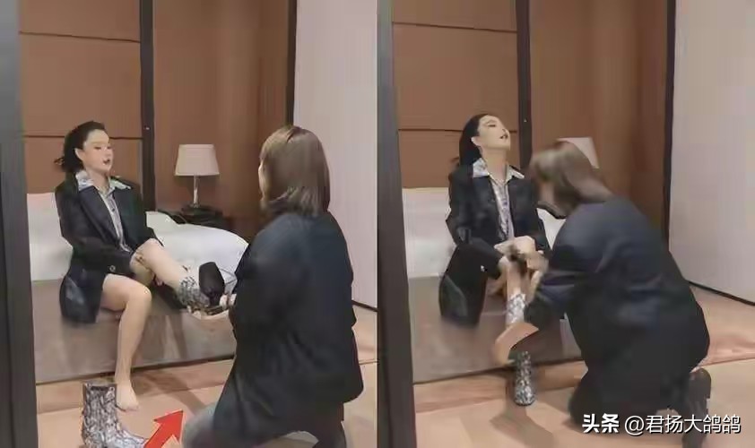 一个给她拿着台本,一个跪在地下为她穿鞋子,跟个丫鬟一样。