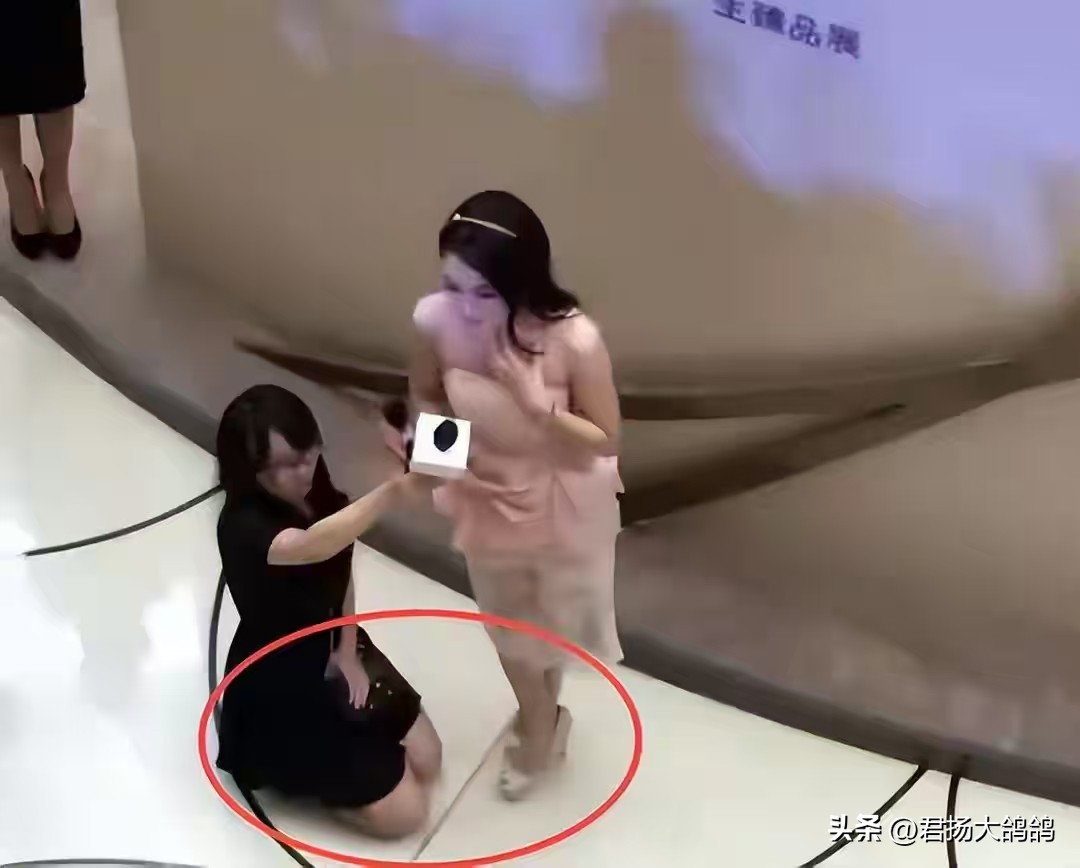 旁边的工作人员,却跪在地上给她举着话筒,这个画面也是相当讽刺了。